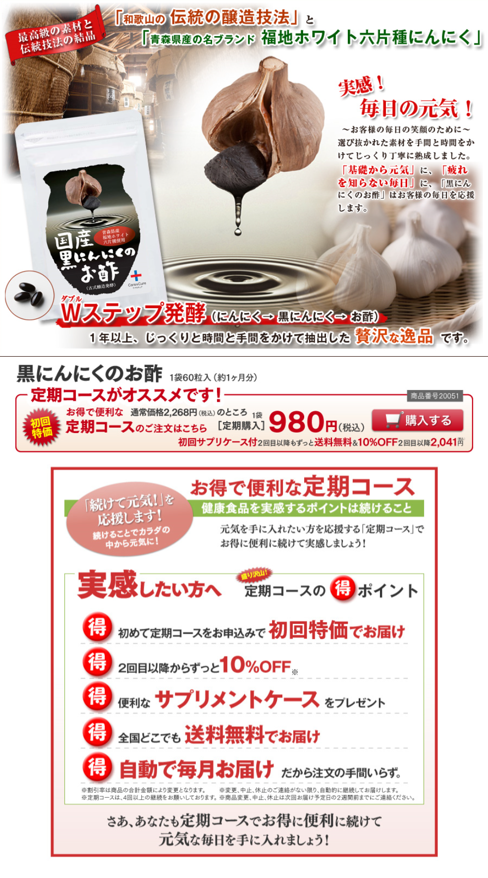 | 商品名 | 黒にんにくのお酢 56%オフさらにプレゼント付き企画 | 商品カテゴリー | 健康食品 |