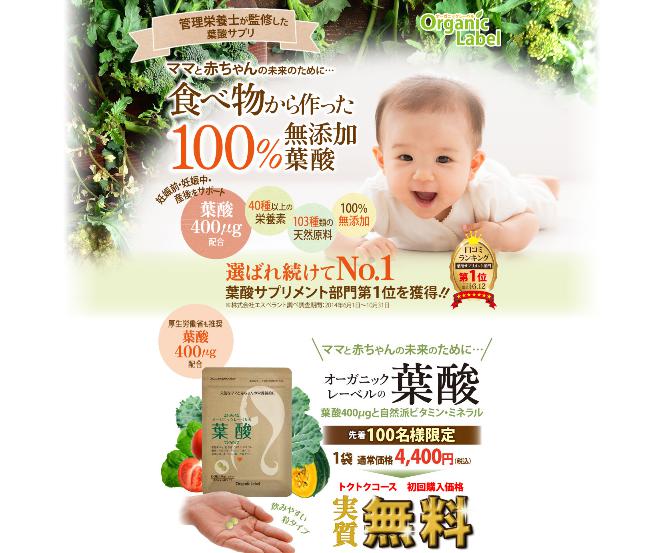 | 商品名 | オーガニックレーベルの葉酸 定期初回実質0円でご提供! | 商品カテゴリー | 健康食品 |