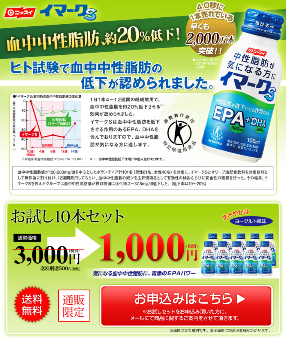 「イマーク」は中性脂肪に悩む方へおすすめする日本初のEPA含有の特定保健用食品です。 EPAとは、青魚に豊富に含まれる中性脂肪を低下させる健康成分です。 ニッスイグループが「海の元気倶楽部」から中性脂肪が気になる方にお届けします。 ぜひお試し下さいませ。