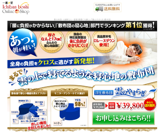 | 商品名 | 【腰痛布団】肩こり腰痛でお悩みの方へ★凹凸加工・体圧分散の浮圧敷き布団【雲のやすらぎ】 | 商品カテゴリー | 健康器具 |